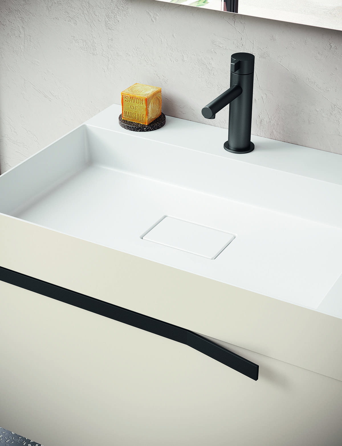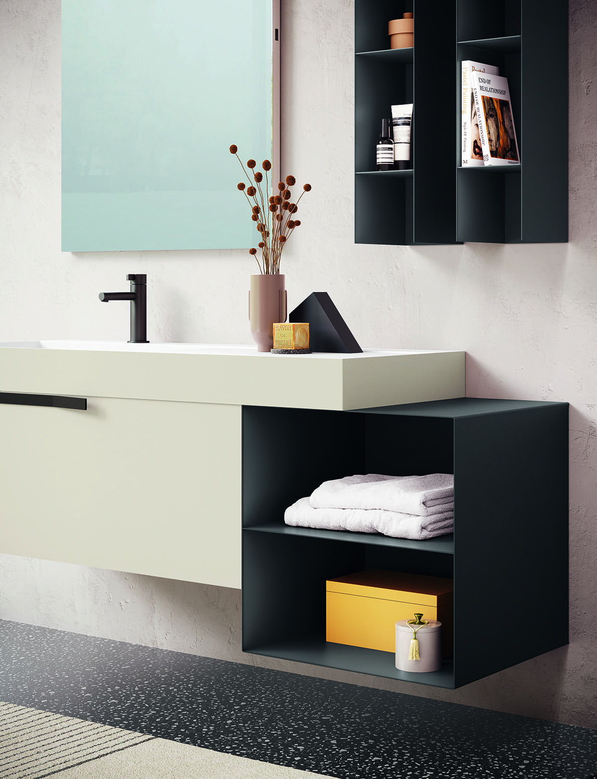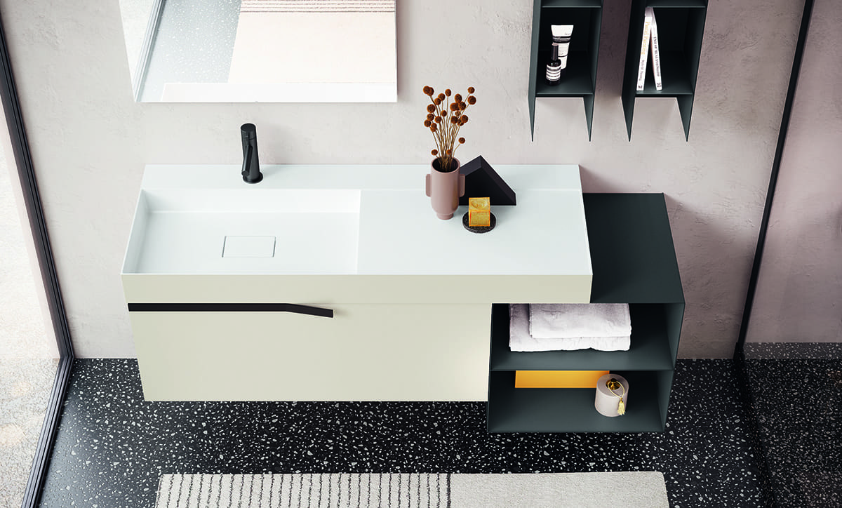 Re-Start Line 16 valorizza il mobile bagno bianco sospeso con volumi essenziali in Conchiglia opaco abbinati al Piombo opaco. La maniglia XL, un sottile profilo metallico piegato, disegna un segno orizzontale pulito e funzionale. Un’estetica rigorosa ma accogliente, personalizzabile per misure e finiture.