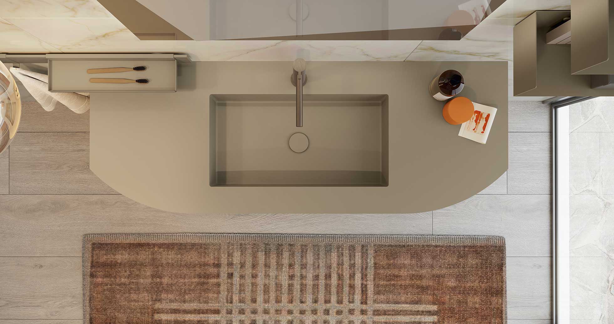 Round 14 celebra il legno e la sinuosità delle forme. La finitura Rovere Nocciola e il top Smart Cappuccino opaco si fondono in un equilibrio caldo e funzionale. Round 14 è un mobile bagno curvo in rovere perfetto per ambienti che privilegiano materiali autentici e linee avvolgenti.