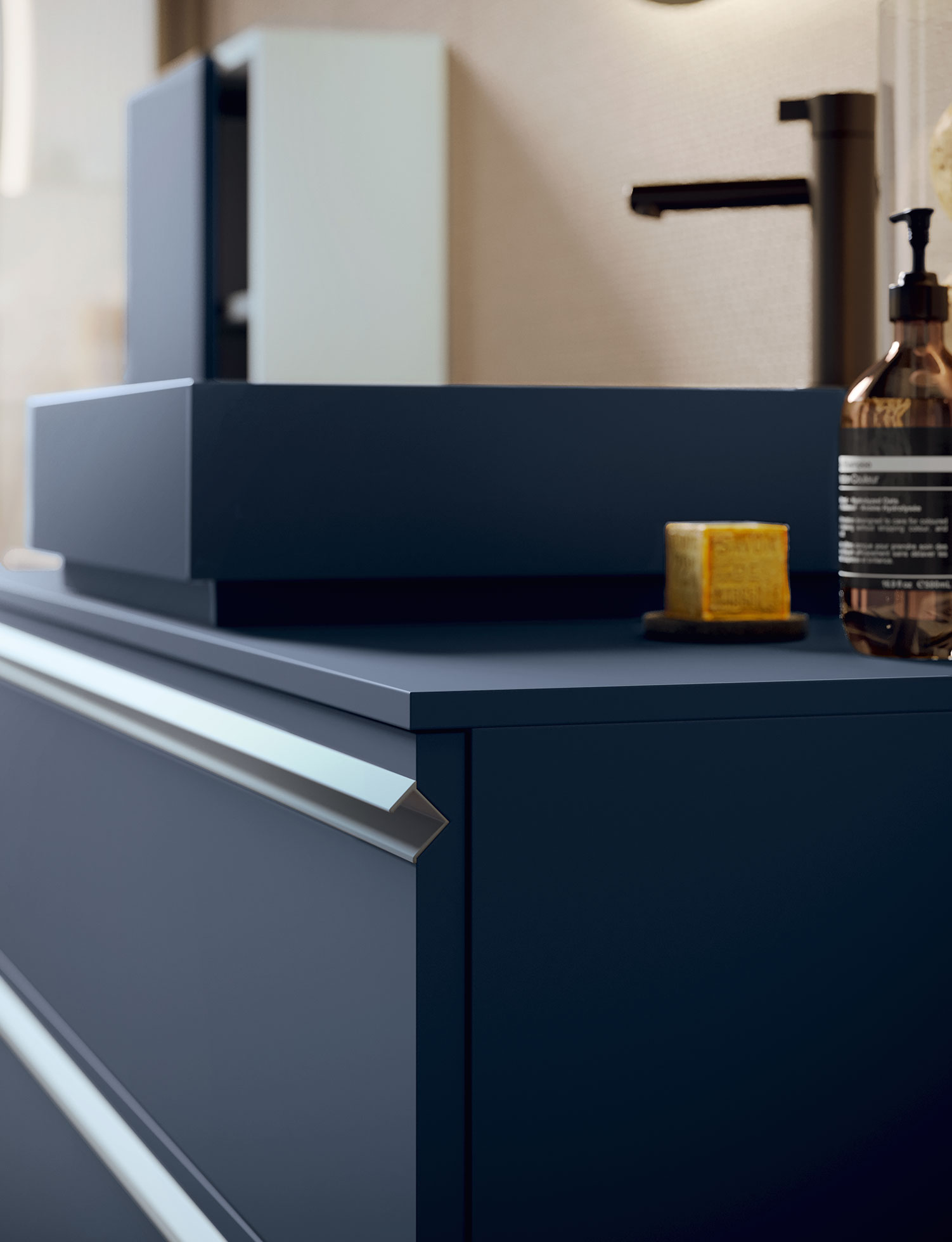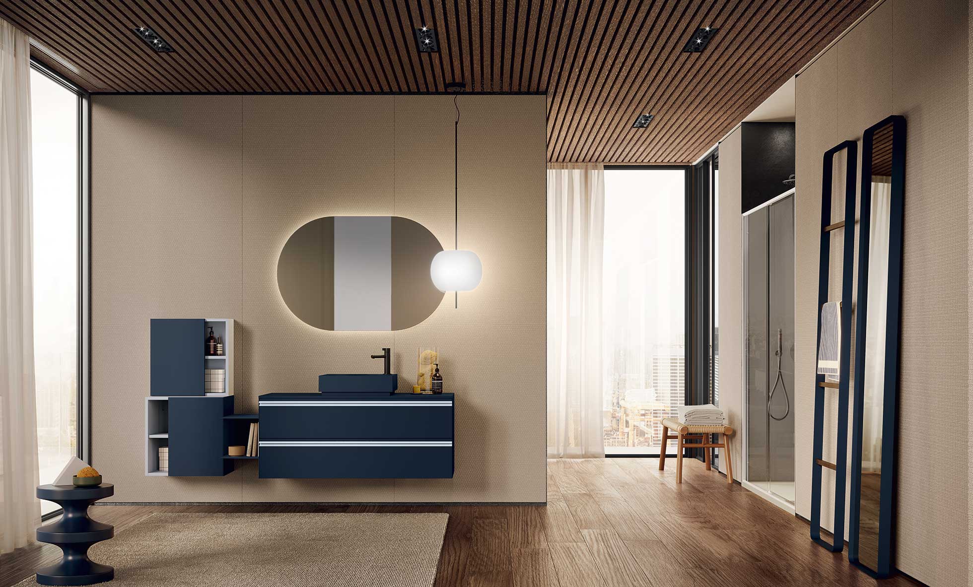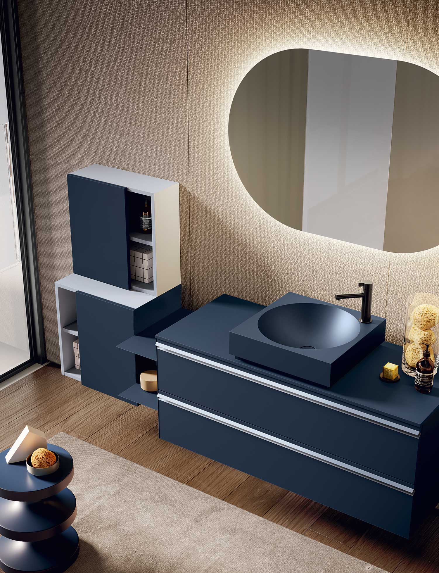 Mobile bagno nelle finiture Blu Notte opaco e Ghiaccio opaco con Maniglia Poker Ghiaccio opaco