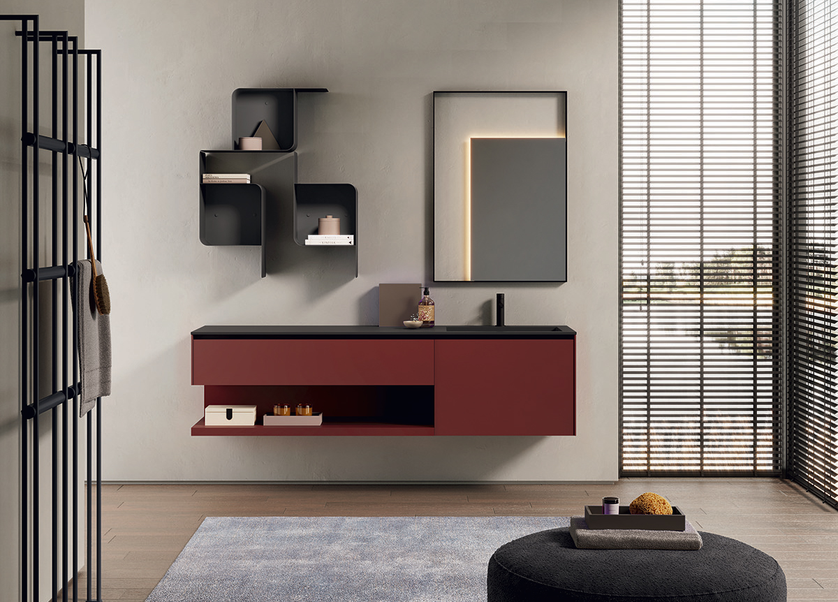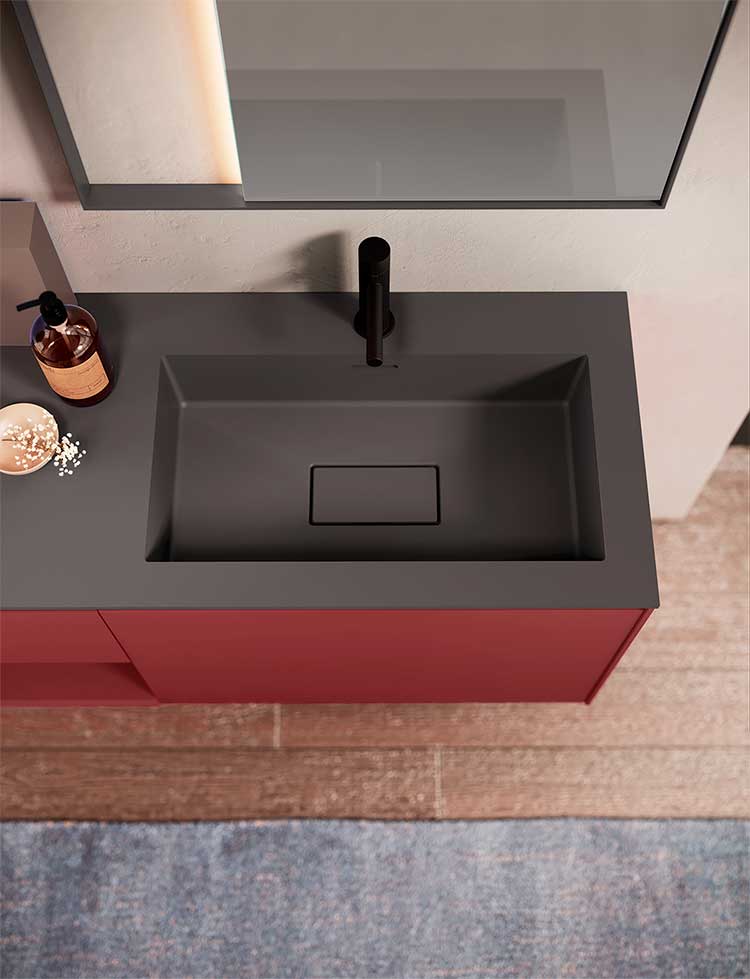 Re-Start Play 14 punta sul contrasto: Rosso Oriente opaco per i volumi, Mistral Piombo per il top con lavabo integrato. La gola continua disegna un segno orizzontale essenziale, mentre il lavabo nero aggiunge carattere e profondità cromatica: un mobile bagno con lavabo nero dal design deciso e contemporaneo.