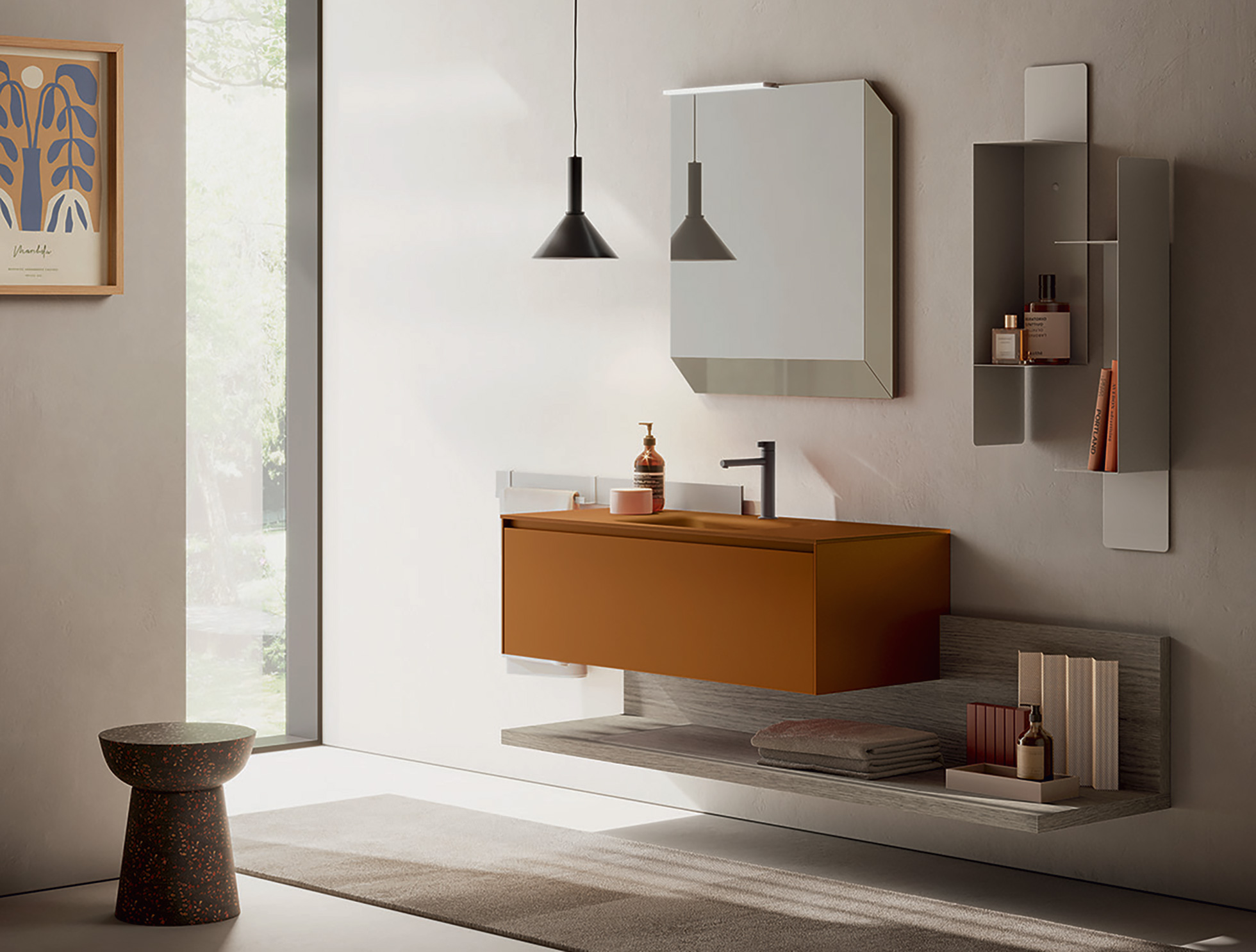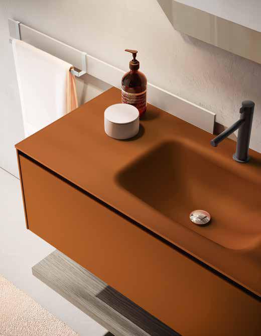 Re-Start Play 10 valorizza l’essenzialità con finiture Ruggine opaco e Selva Castoro, gola continua e top in vetro extralight acidato Ruggine con lavabo integrato. I mensoloni a giorno alleggeriscono la composizione e offrono spazio espositivo: un mobile bagno con vano a giorno pensato per progetti moderni, equilibrati e funzionali.