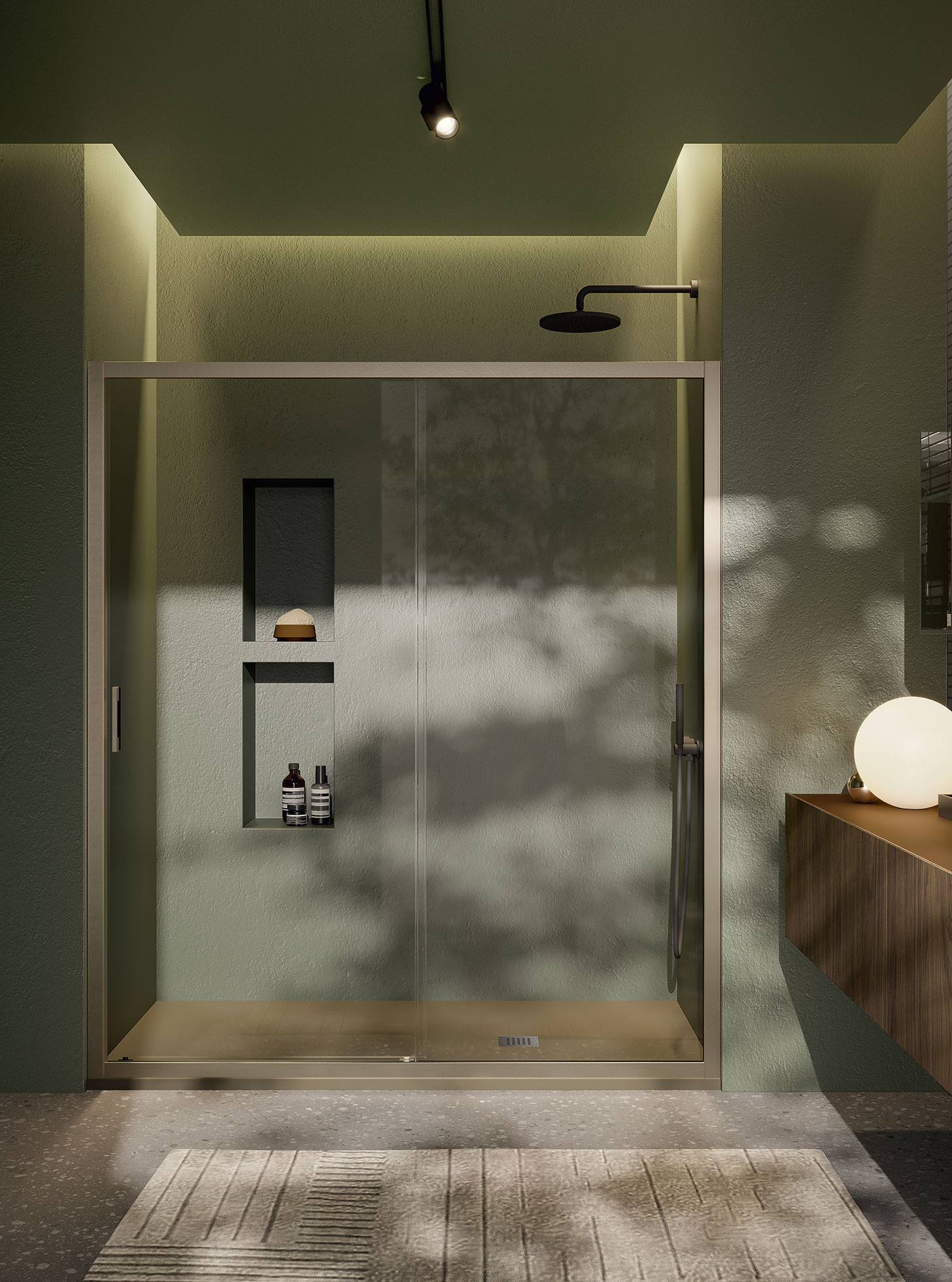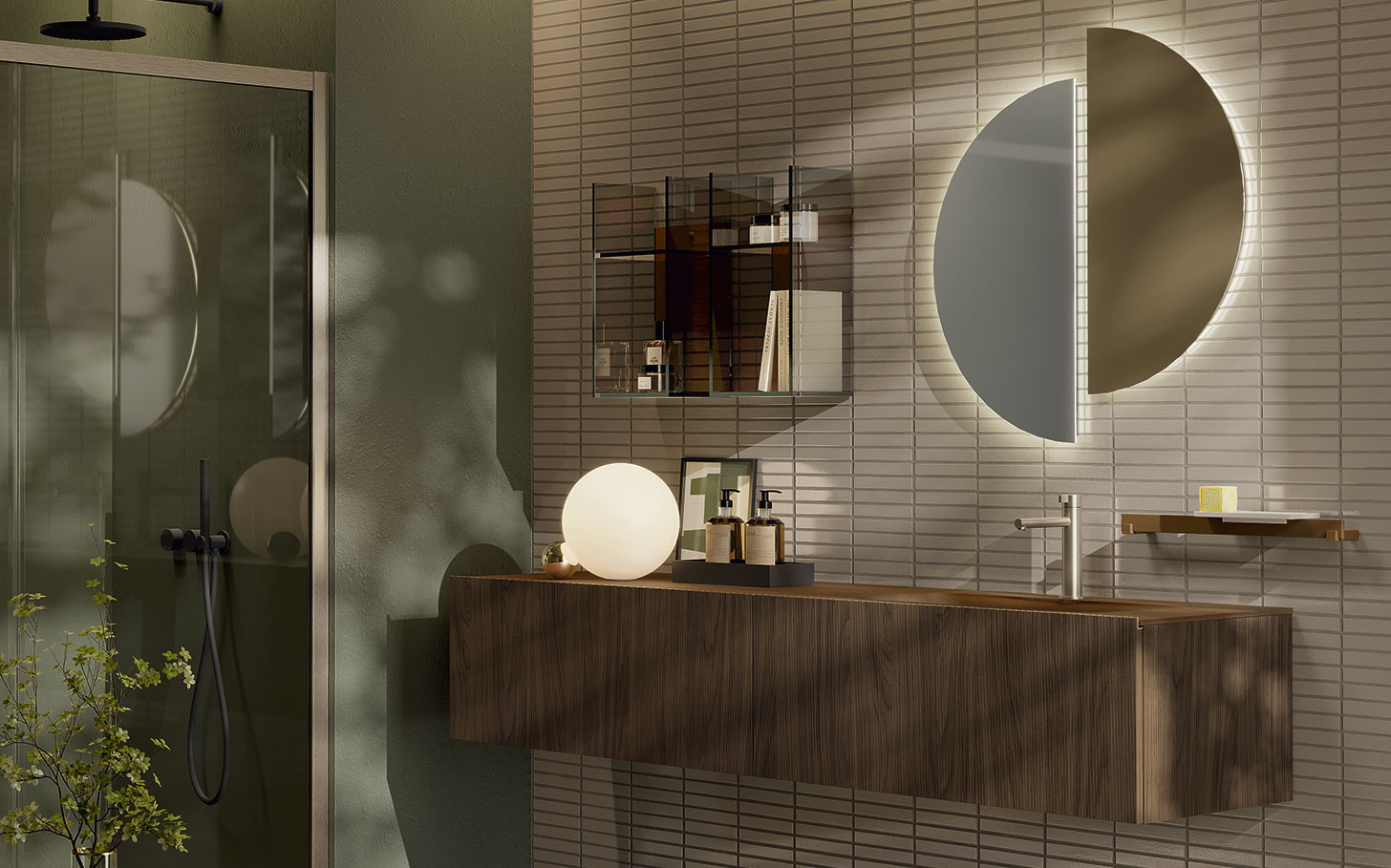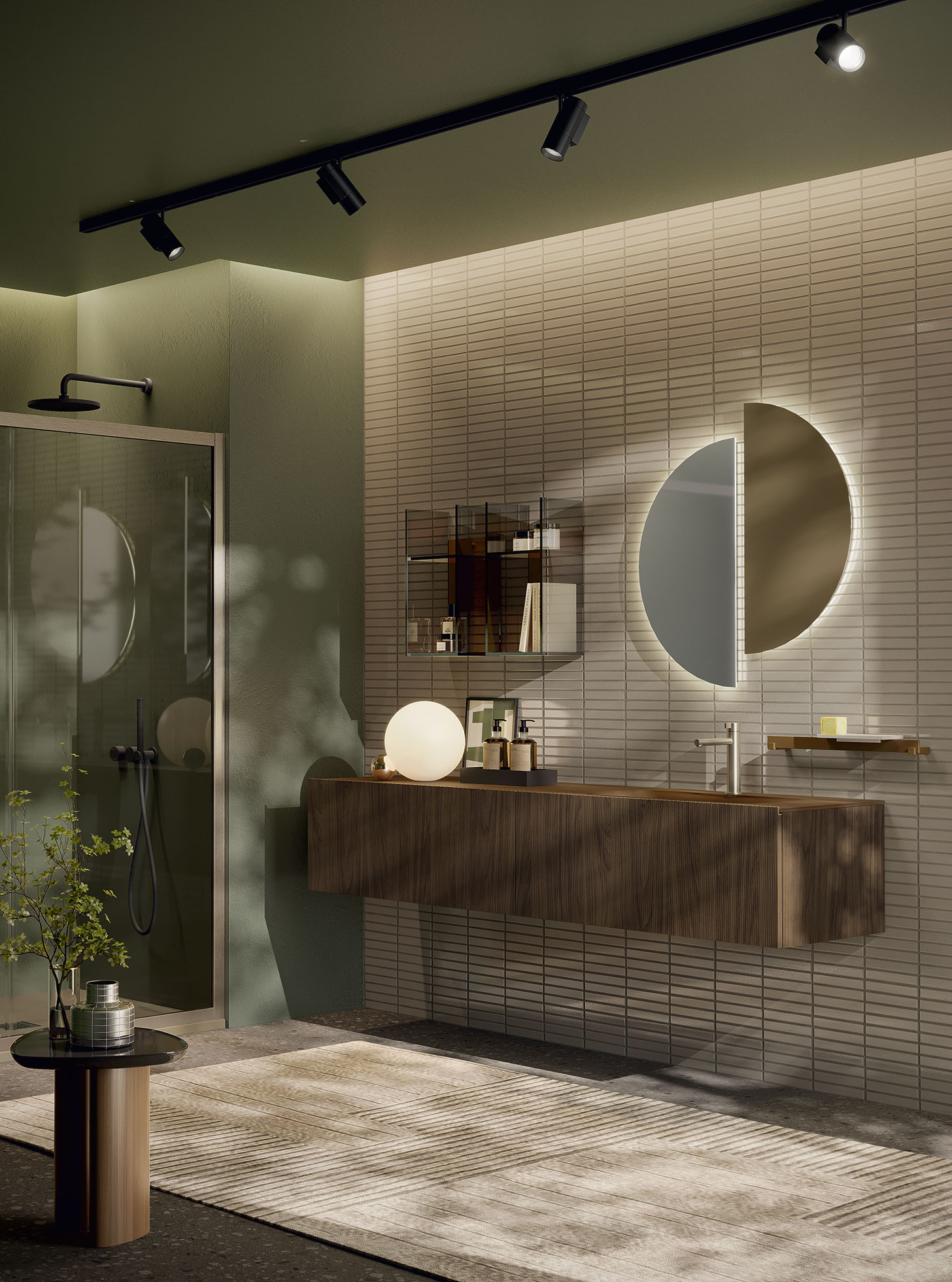 Con la sua finitura Linea Wood dalle venature verticali e il profilo salvagoccia Nichel, Slide 07 è un mobile bagno moderno in legno in cui eleganza e funzionalità convivono. Il top in vetro acidato extralight Corteccia completa la composizione, offrendo un’estetica naturale e raffinata.