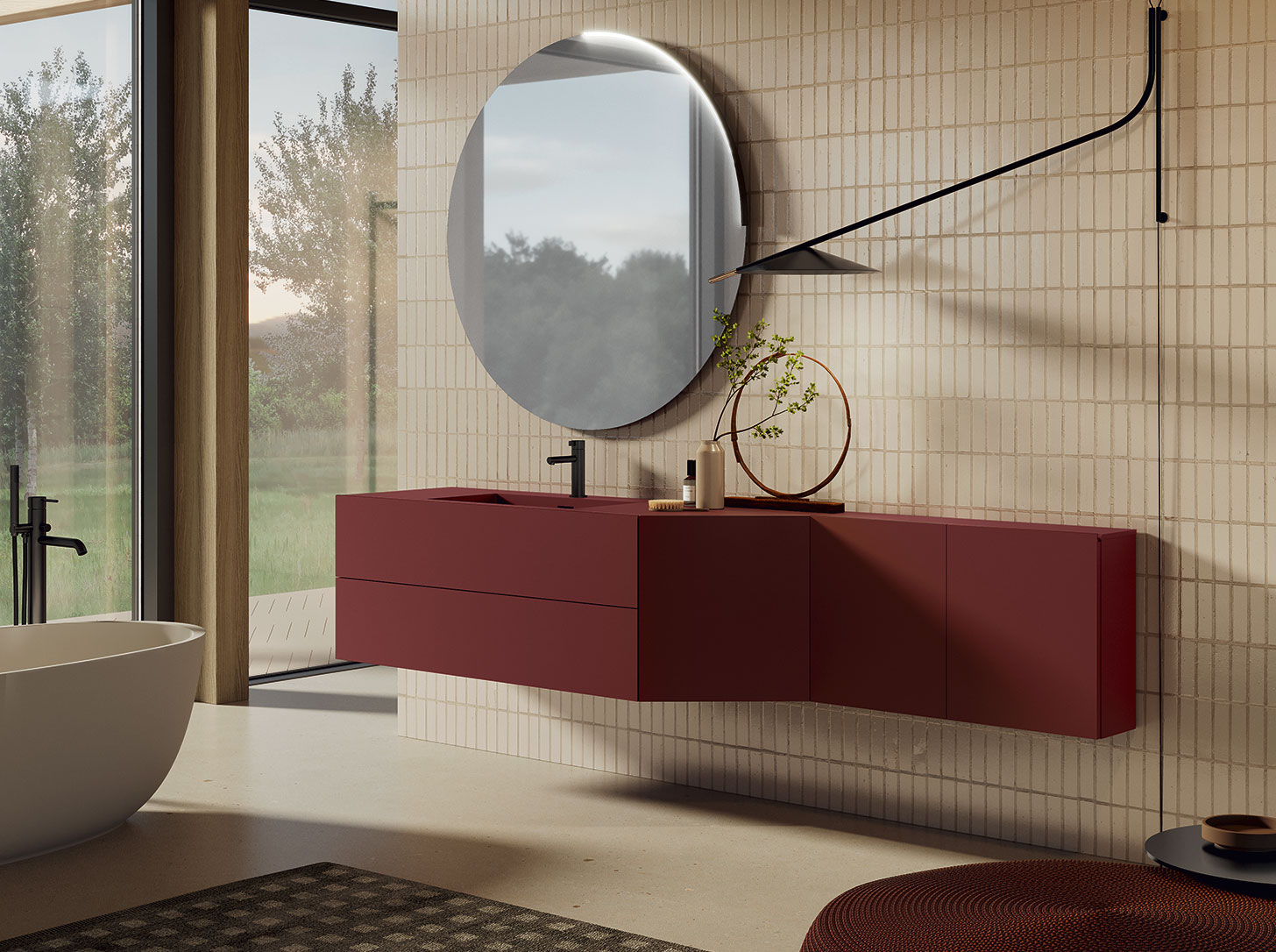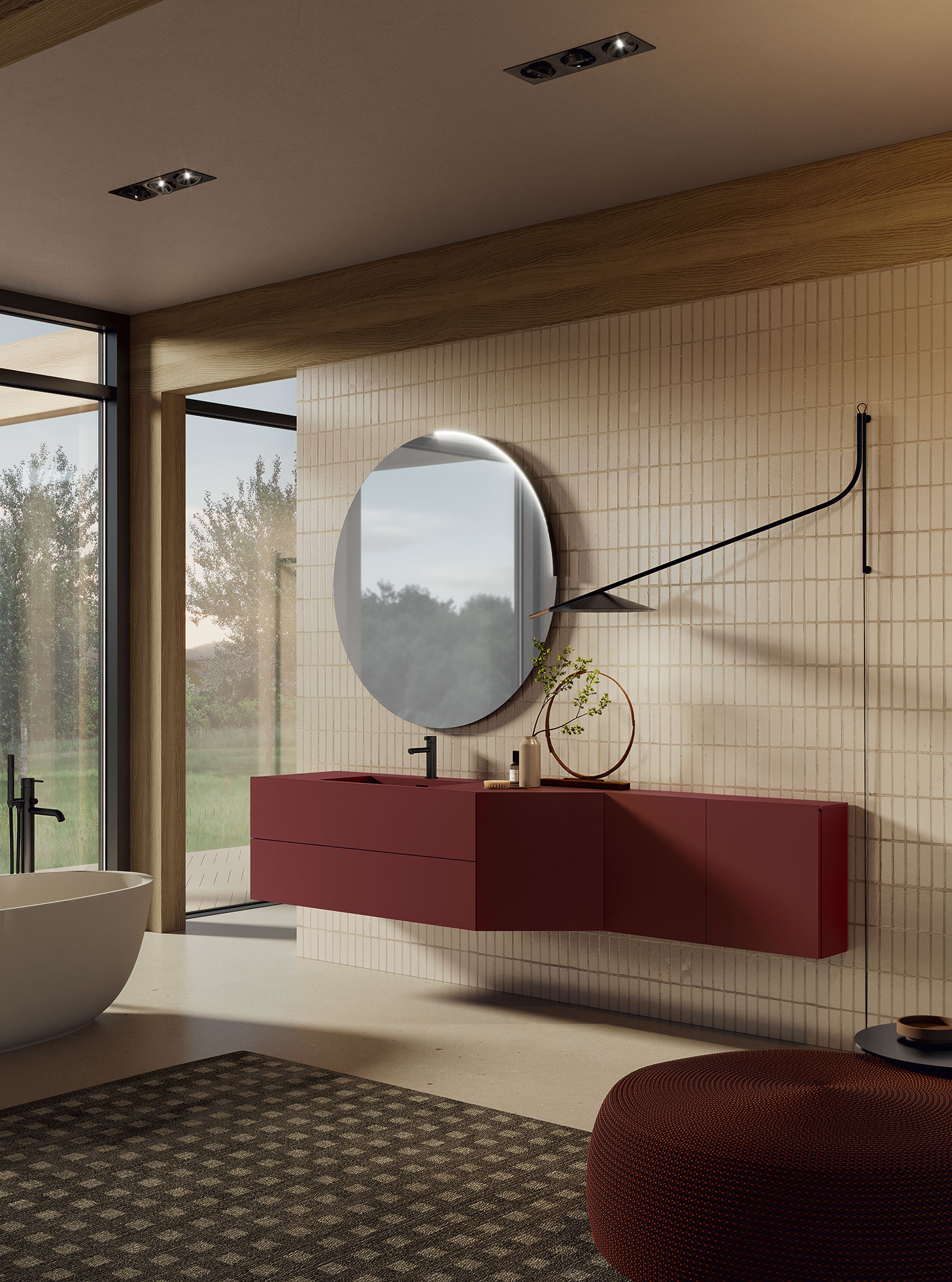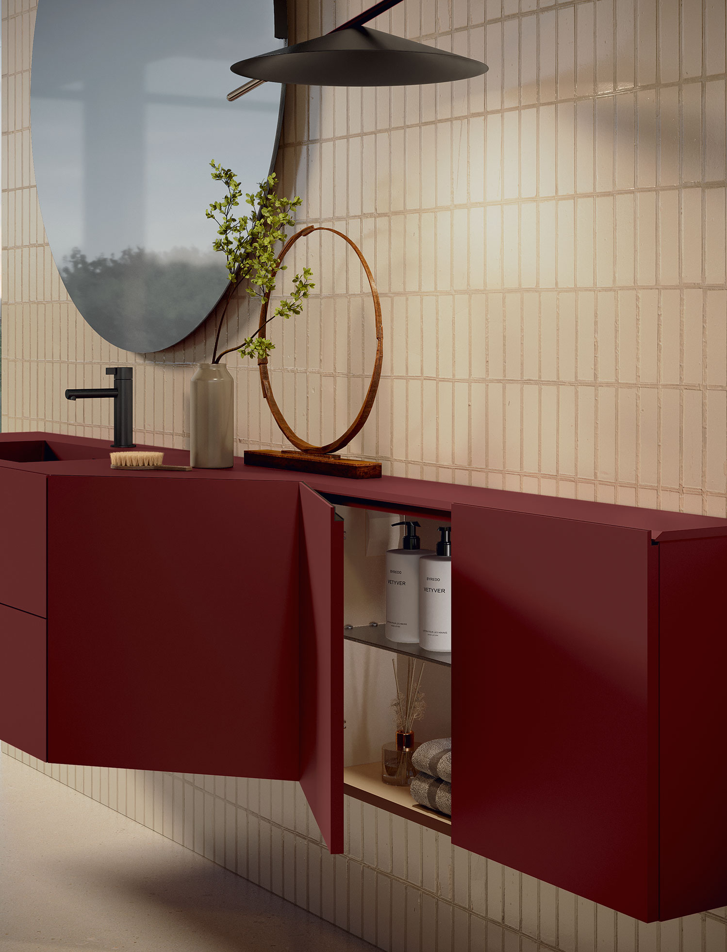 In Slide 02 ogni dettaglio è essenziale: moduli compatti a profondità ridotta, top in Mineral Tech Rosso Oriente e apertura con profilo nero creano un mobile bagno moderno sospeso capace di coniugare carattere, funzionalità e minimalismo. Una soluzione smart per spazi dal design audace.