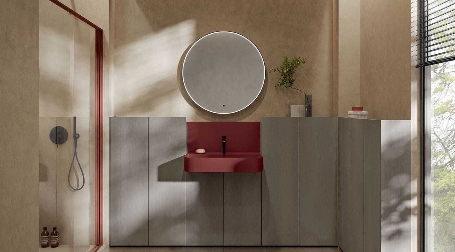 Slide 11 reinterpreta la composizione bagno con un gioco cromatico originale e dettagli salvaspazio. La finitura Time Cenere incontra lo schienale Rosso Oriente e i contenitori Twenty con illuminazione integrata, dando vita a un mobile bagno particolare, funzionale e altamente personalizzabile.
