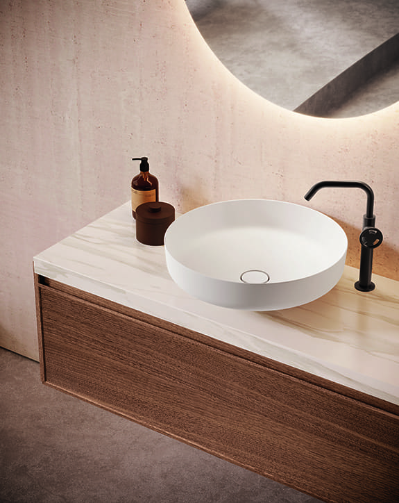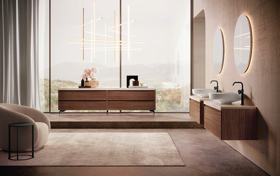 Le specchiere round e il lavabo Heritage in Solid Surface in appoggio rendono unico e moderno lo stile di questa composizione. Le madie della collezione Heritage completano il tuo bagno con stile.