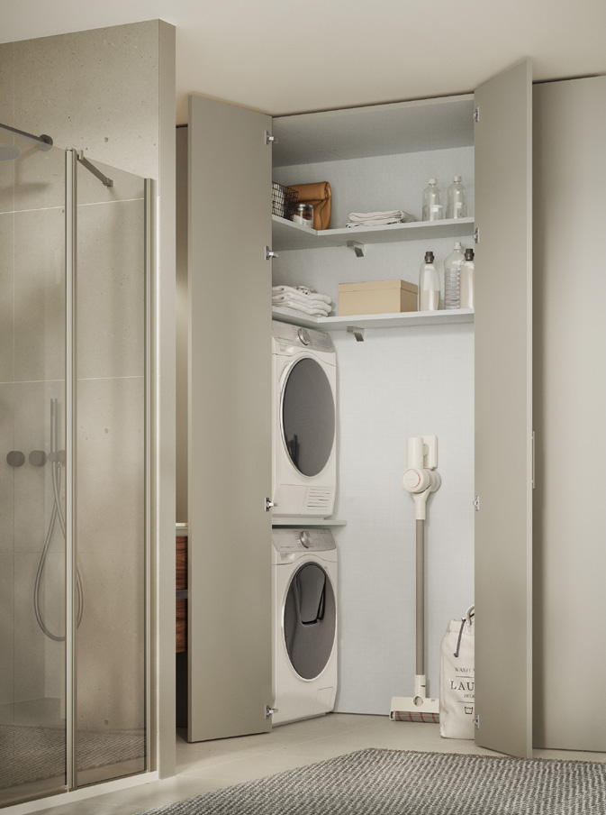La collezione Passepartout trova spazio anche nell’arredamento per piccoli bagni. Con le nostre soluzioni ogni spazio è organizzato al centimetro, senza tralasciare il design e l’armonia tra gli elementi che contraddistingue Artesi. In questo arredo troverai la combinazione di box doccia, mobile bagno sospeso e armadio a doppio angolo portalavatrice e asciugatrice.
