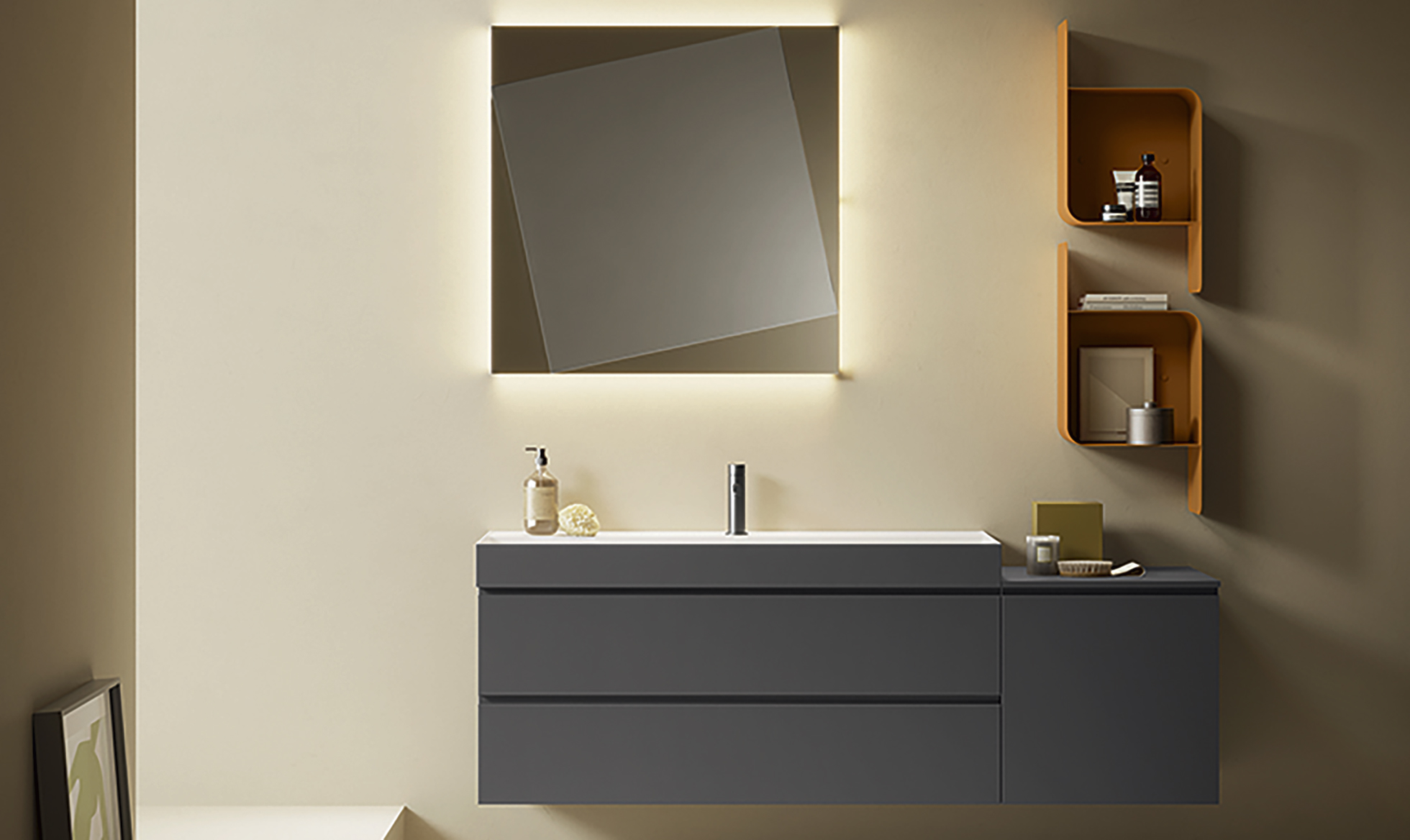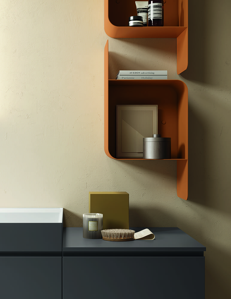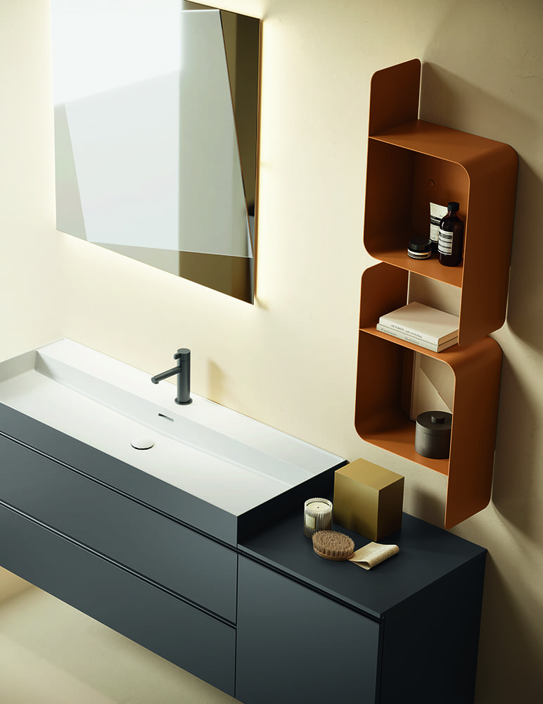 Yang 03 propone un’estetica rigorosa e contemporanea: scocca, ante, gole e bordo lavabo in Piombo opaco, perfettamente coordinati, definiscono volumi netti e continui. Il top Rail in Mineral Tech bianco opaco introduce un contrasto misurato. Un mobile bagno grigio scuro per progetti essenziali e accoglienti. Personalizzabile per misure e composizioni, offre capienza ordinata e superfici facili da mantenere, ideali per ambienti residenziali moderni.